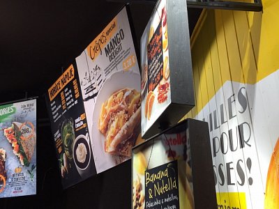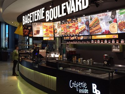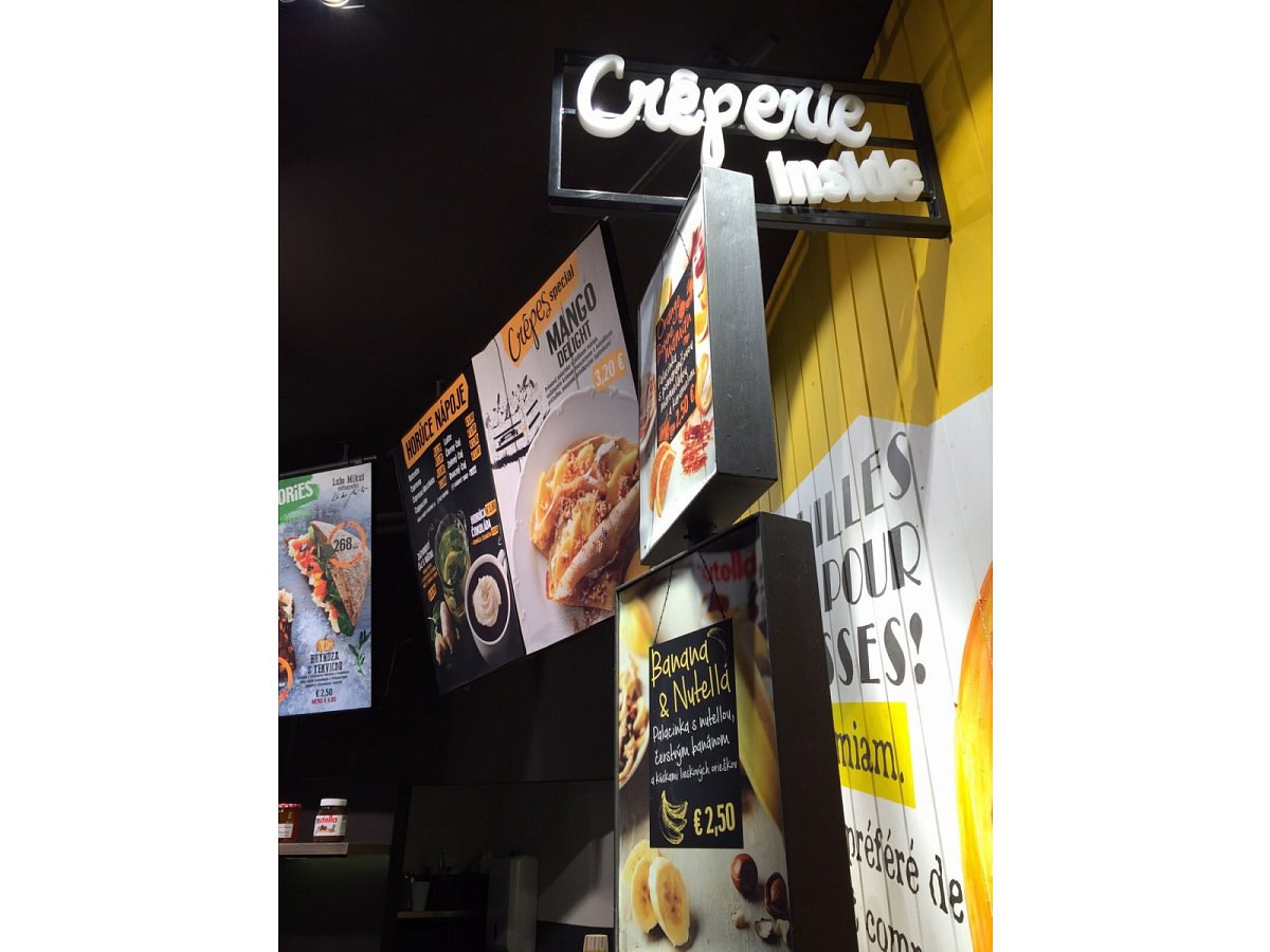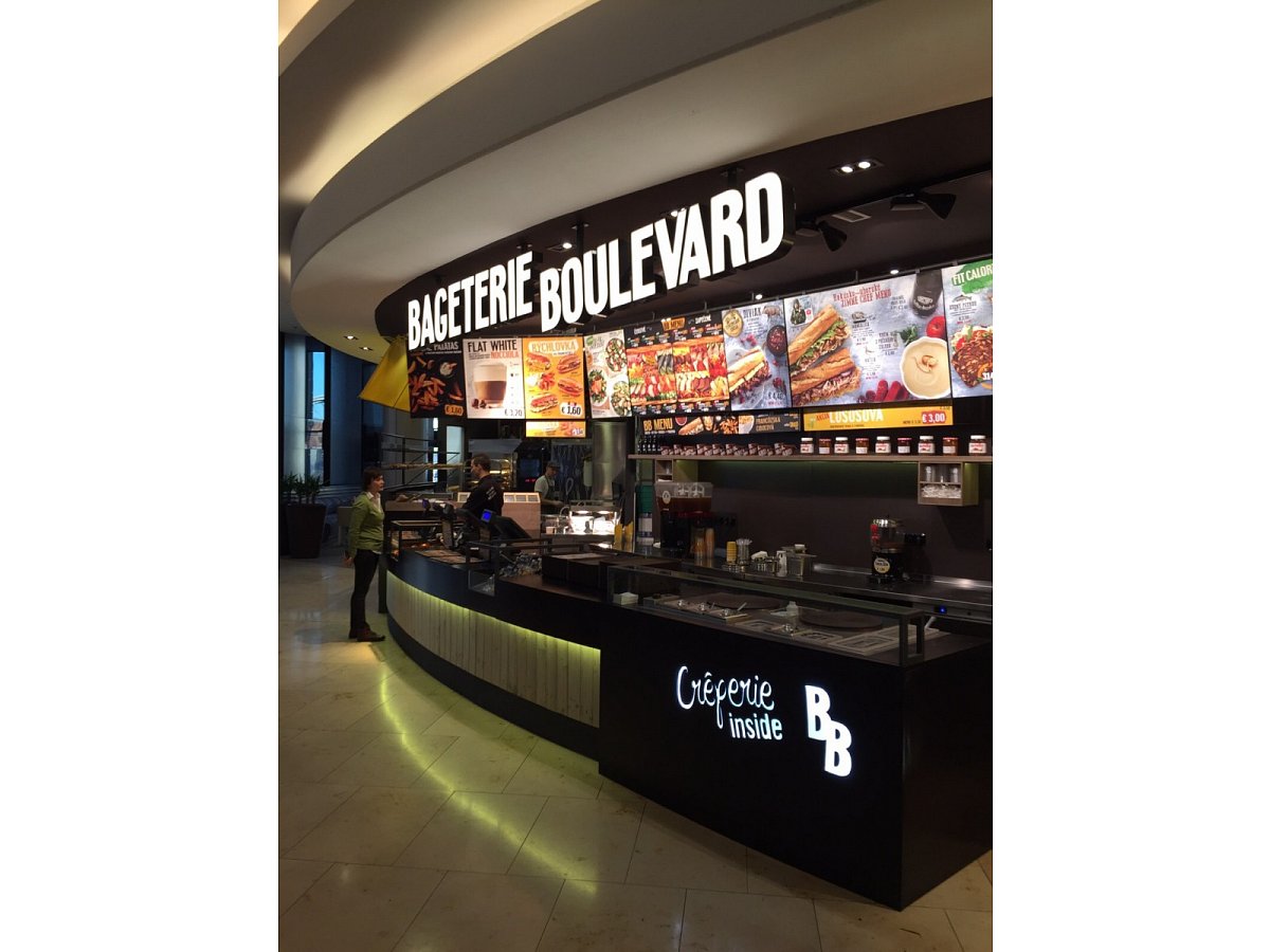 Rebranding of interior elements of Bageteria Boulevard in Bratislava. Project entailed creating a crepe making corner.