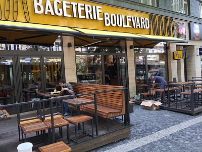 The objective was to manufacture and install the entire front patio area for a Bageterie Boulevard branch in Prague. Come see the trendy tables and sofas on Francouzská street!