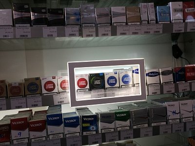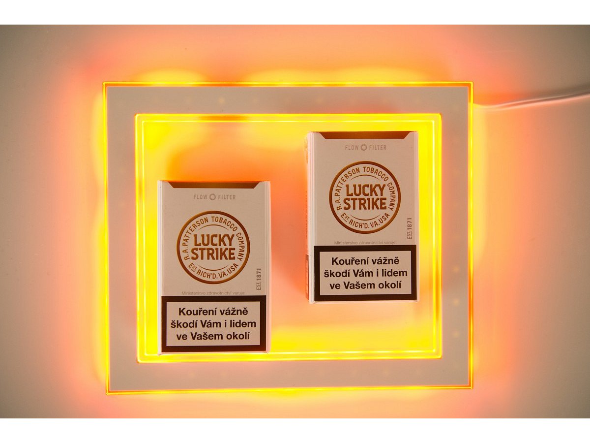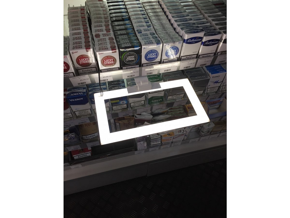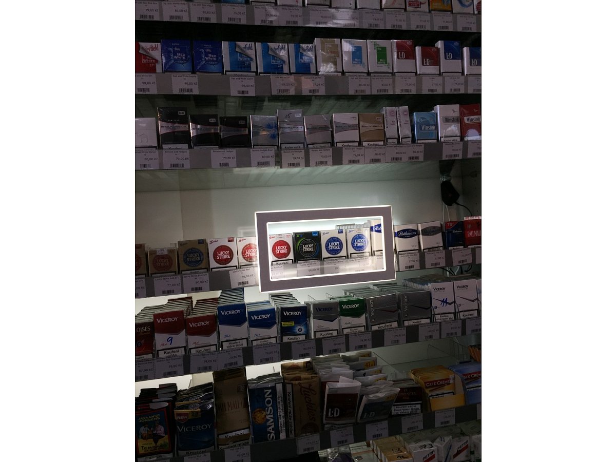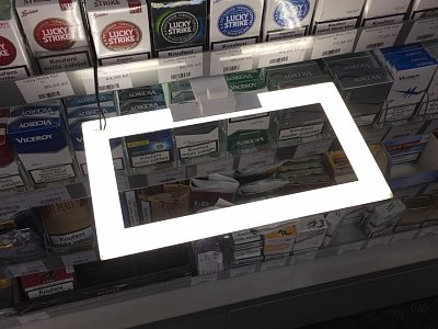 Designed for client British American Tobacco, this frame is backlit with automatic sensors that come on when a customer walks by the products.