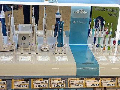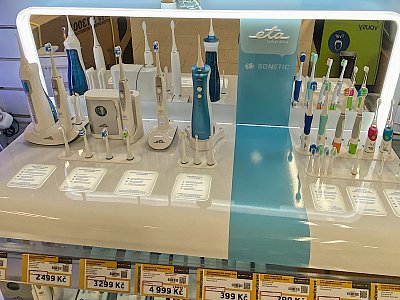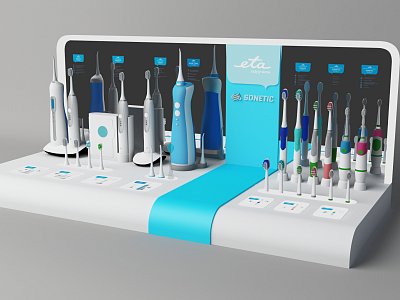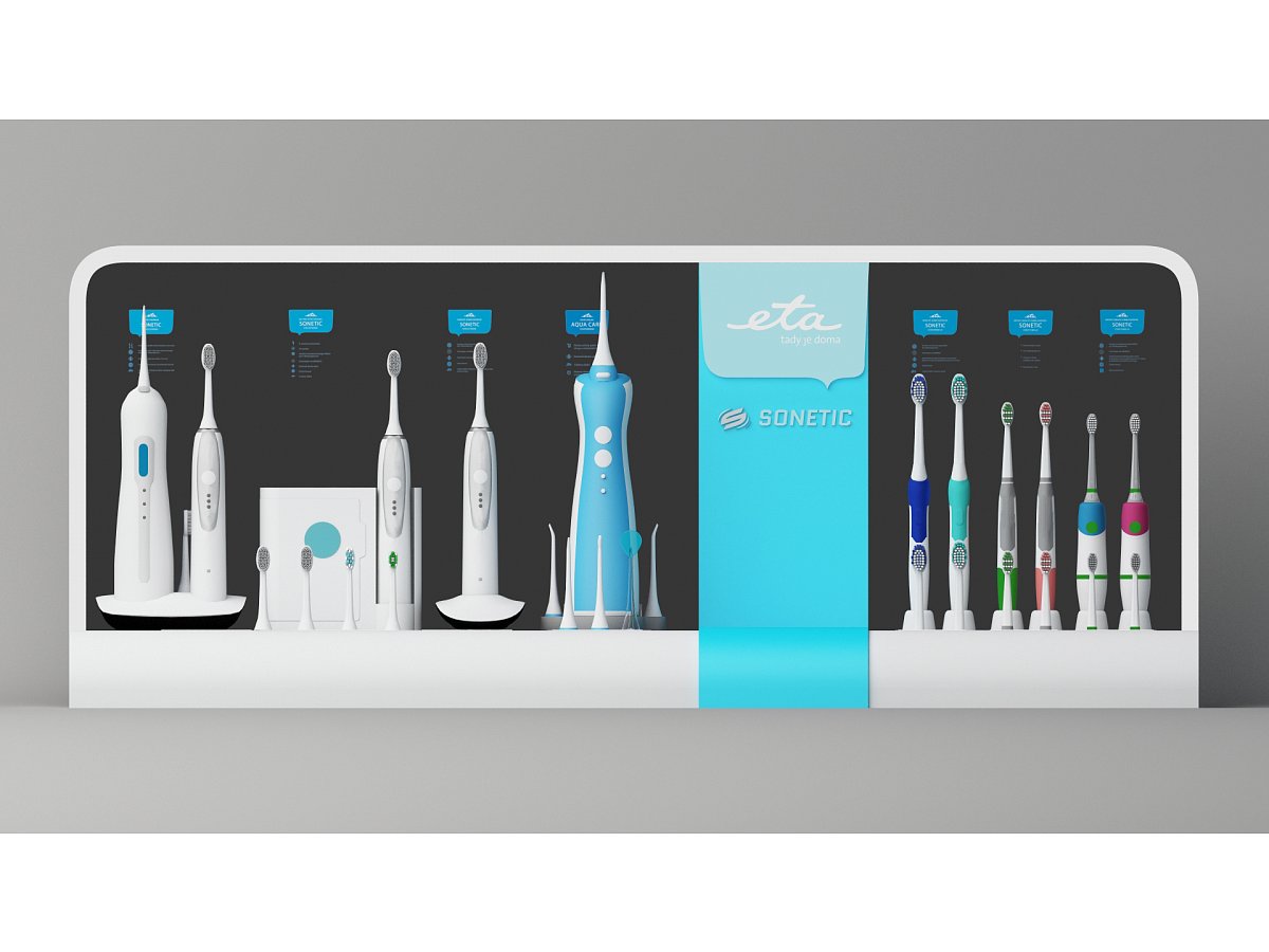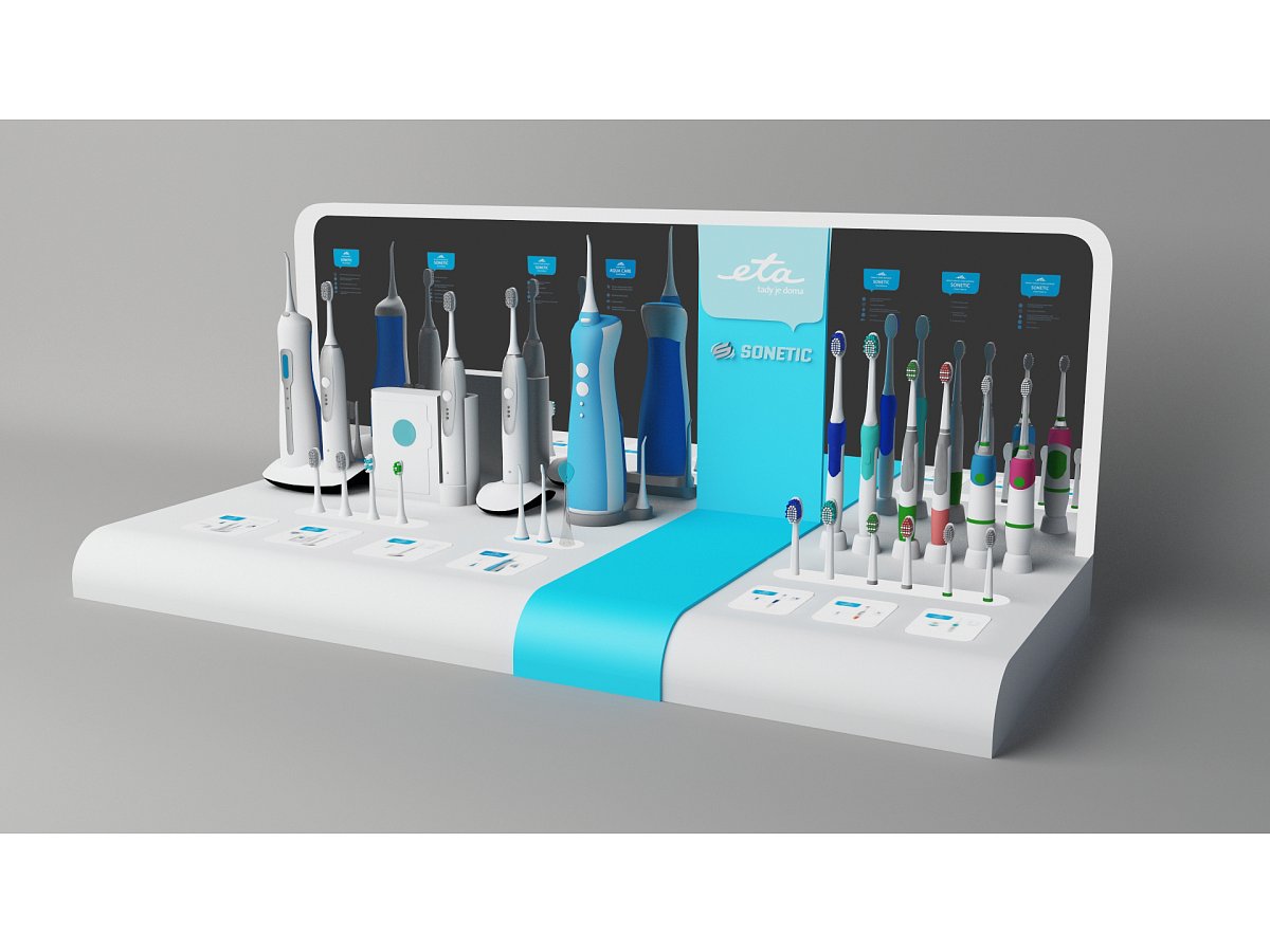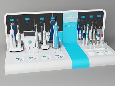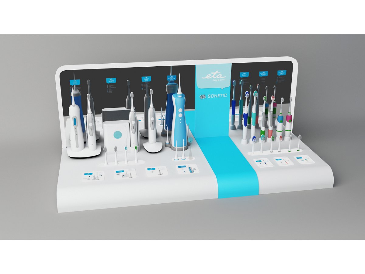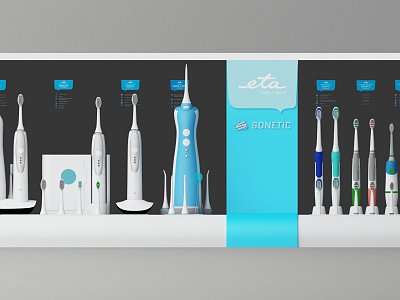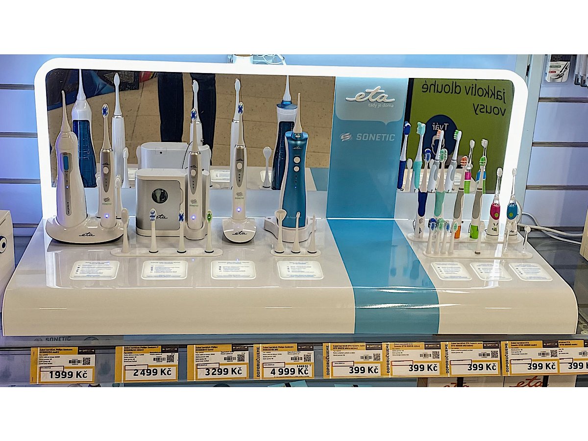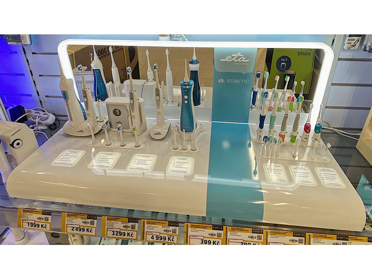 This display was designed for the presentation of sonic toothbrushes. It includes a luminous frame and a mirror in the background to mimic the feeling of a home setting. The brushes are secured against theft so that customers can demo the product closely.