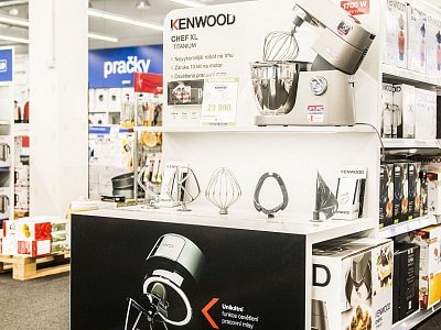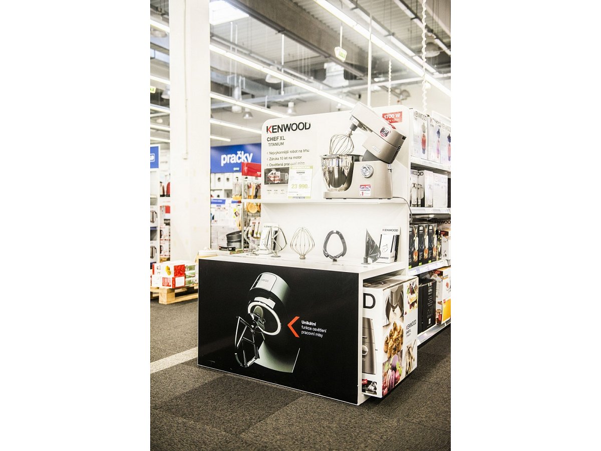 Designed for display of premium Kenwood XL Chef Titanium robot, which is mounted on a shelf in the upper level of the mount. All accessories are displayed under the shelf allowing the customer to demo it directly. The lower part of the endcap is used to store two boxes of additional inventory.