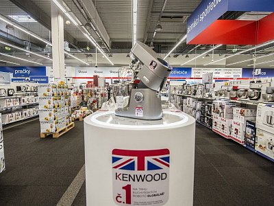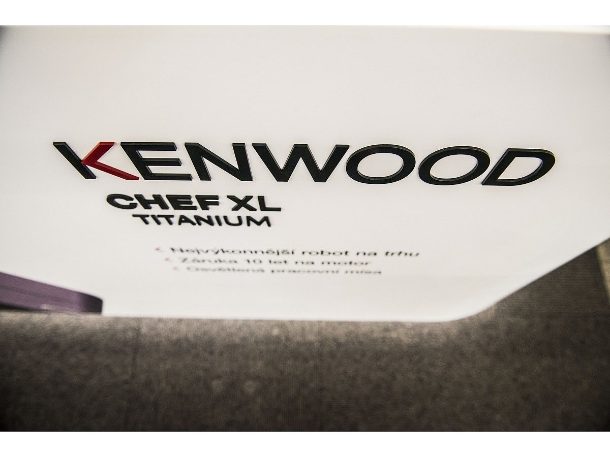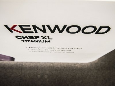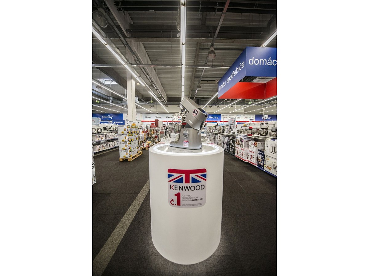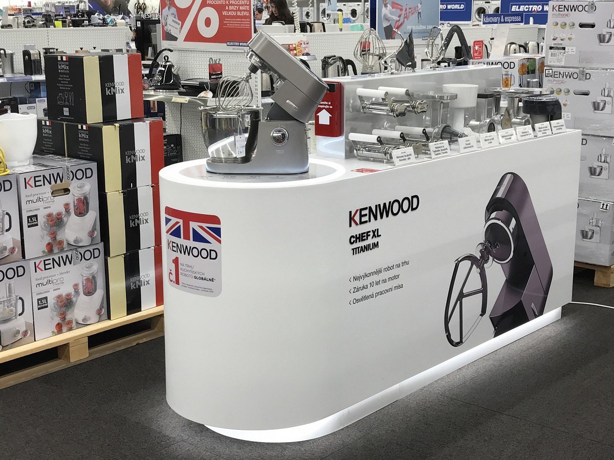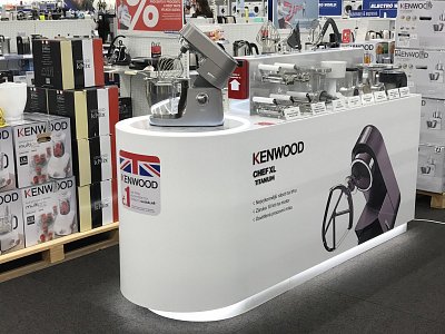 The middle part and the perimeter of the table with the description are used to display all the accessories that are supplied with the robot. There is also a 3D logo, corporate colors of the company and a plastic stand for flyers and more information about the products offered.