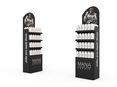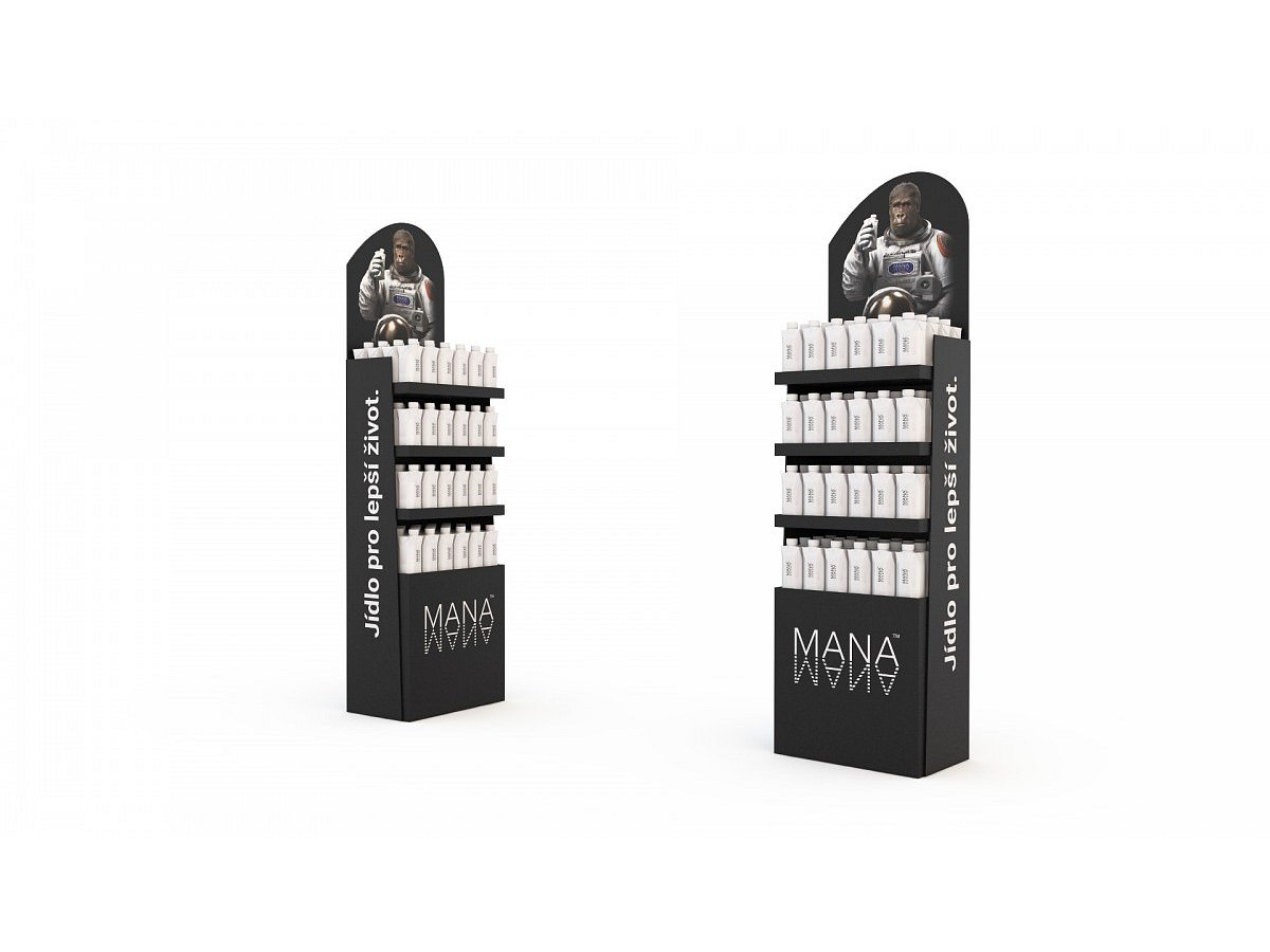 A series of these were was created for the introduction of products into other sales networks in the Czech Republic and Slovakia. The cardboard stand is made in two versions – for floor or counter placement. The upper part contains the standard MANA gorilla and the lower part showcases the company’s slogan in 2D.