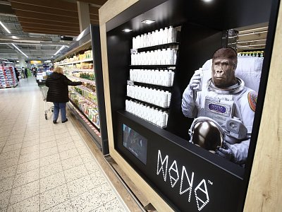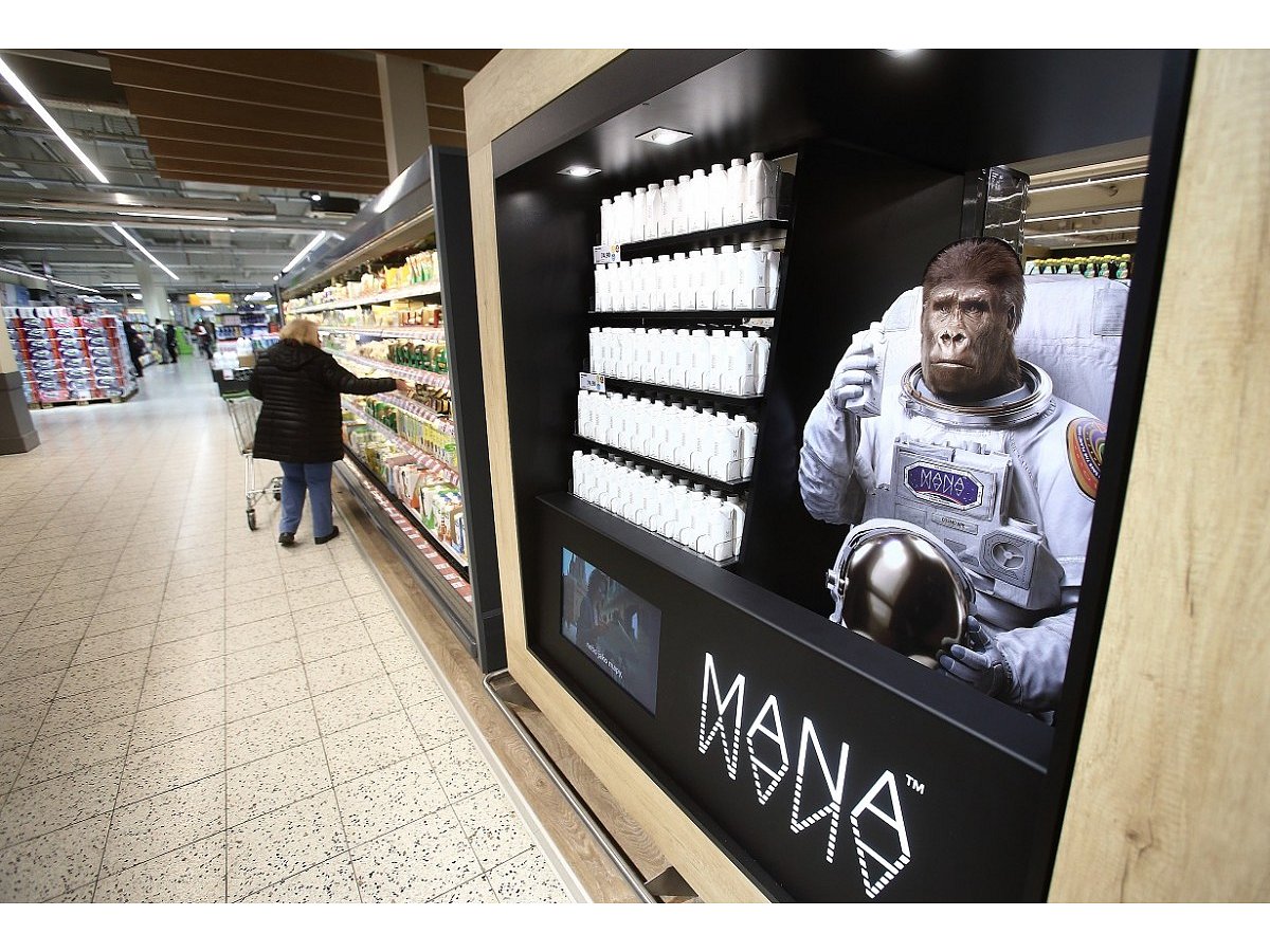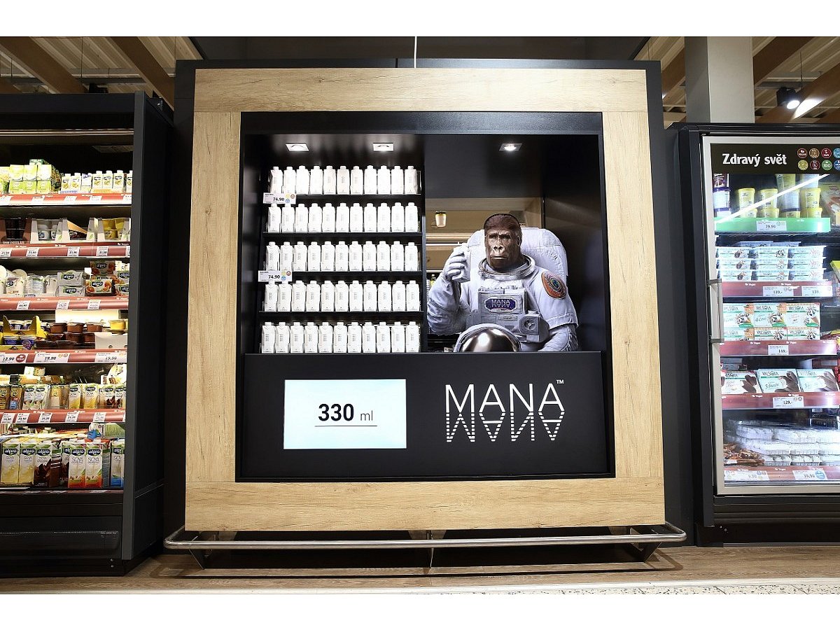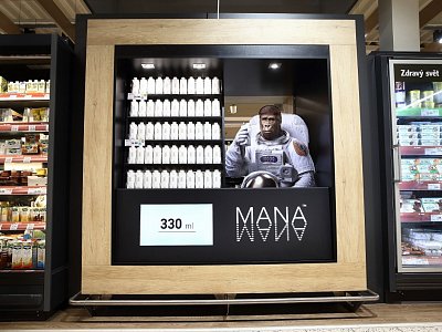 The window display consists of two parts that are illuminated by LED light. One part is dedicated to the presentation of the brand that includes a large MANA gorilla in a spacesuit, and the other part displays the product. A mirror was inserted behind the products to give the impression of infinity.