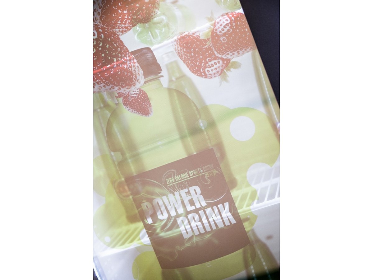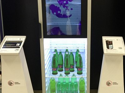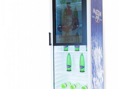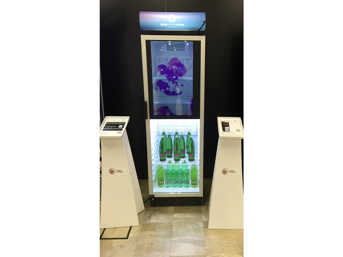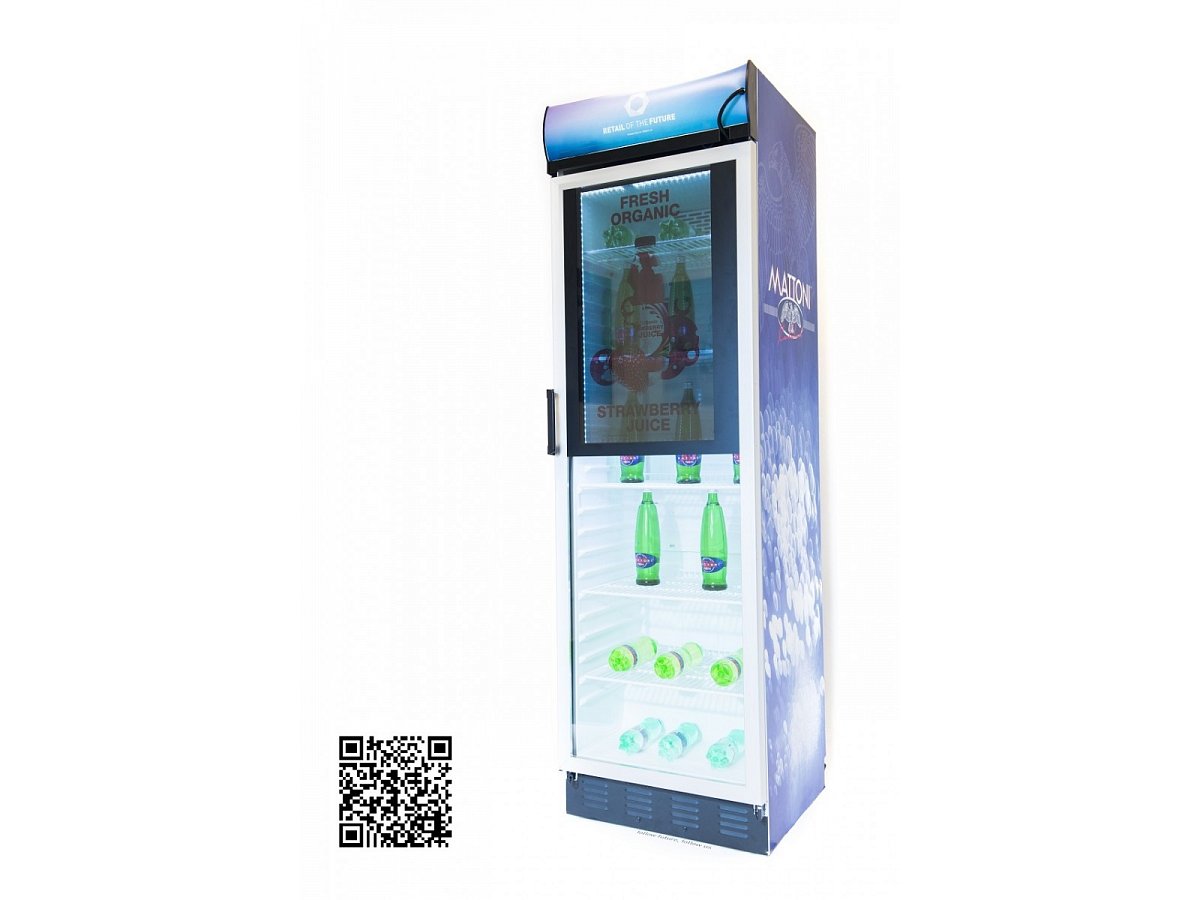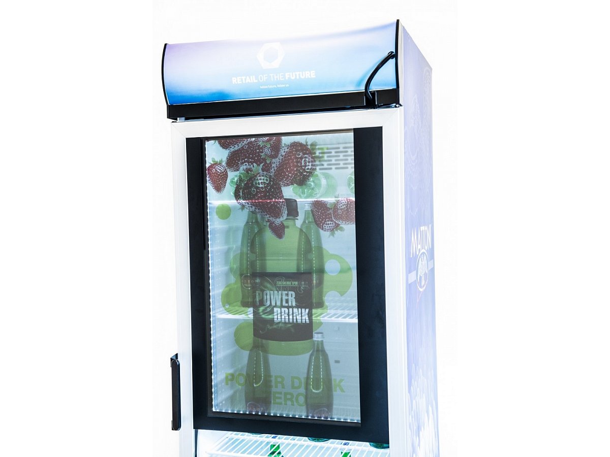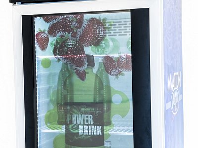 Standard refrigerator with a transparent screen built into the glass door. The fridge is controlled via a small computer with the possibility of remote management, so that the change of visuals on the screen can be handled by the client himself.